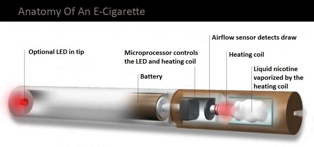In many e-cigarettes, puffing activates the battery-powered heating device, which vaporizes the liquid in the cartridge. The person then inhales the resulting aerosol or vapor (called vaping).